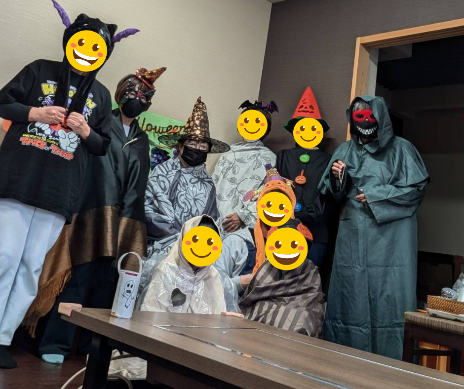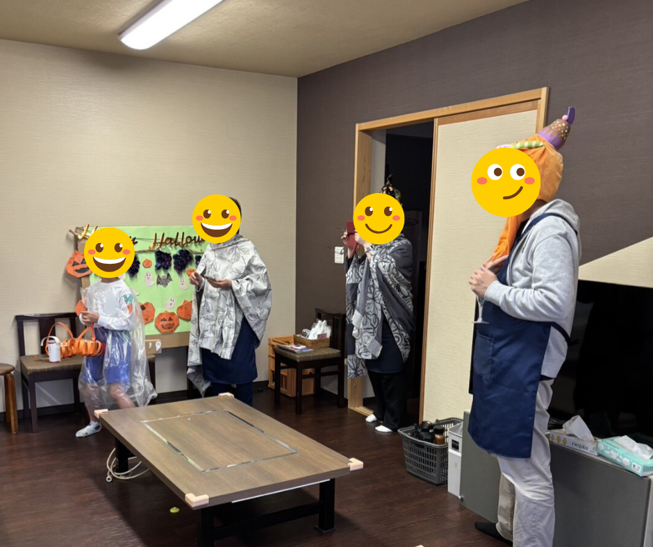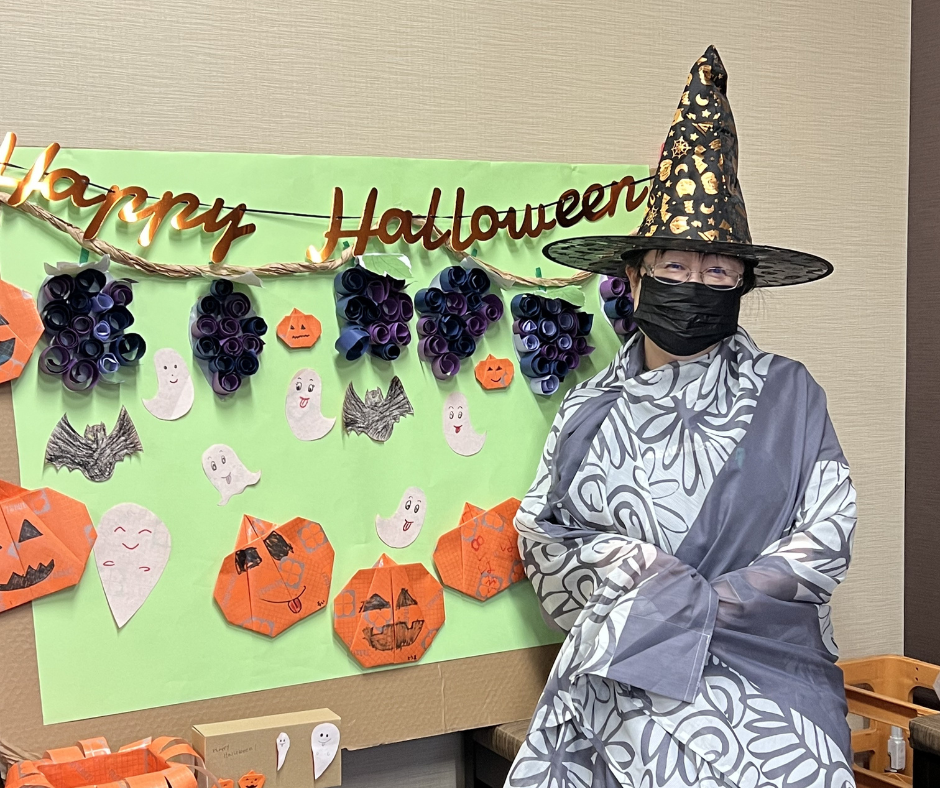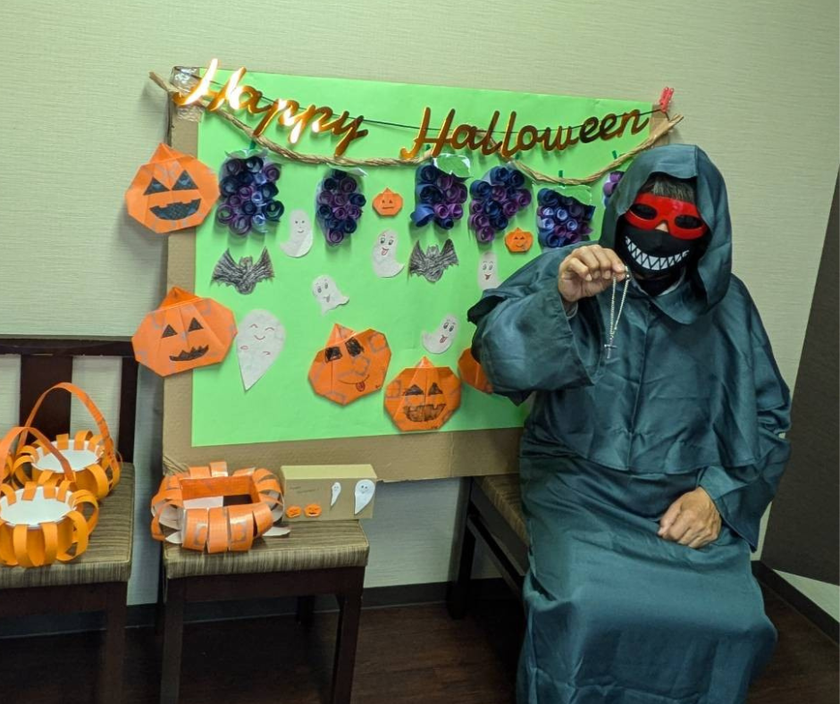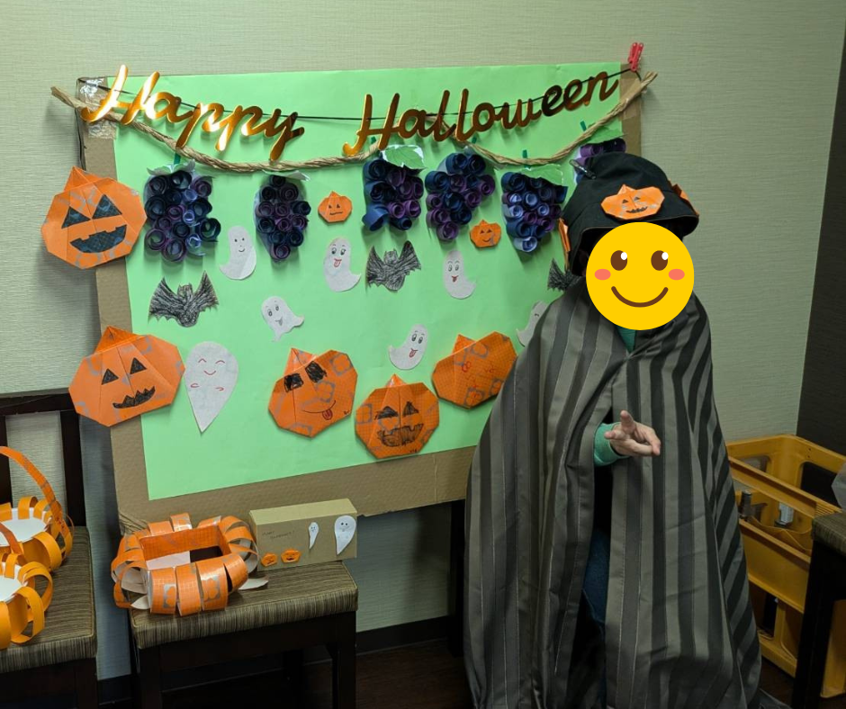 施設内はハロウィンの飾りで彩られ、職員も思い思いの仮装で登場。