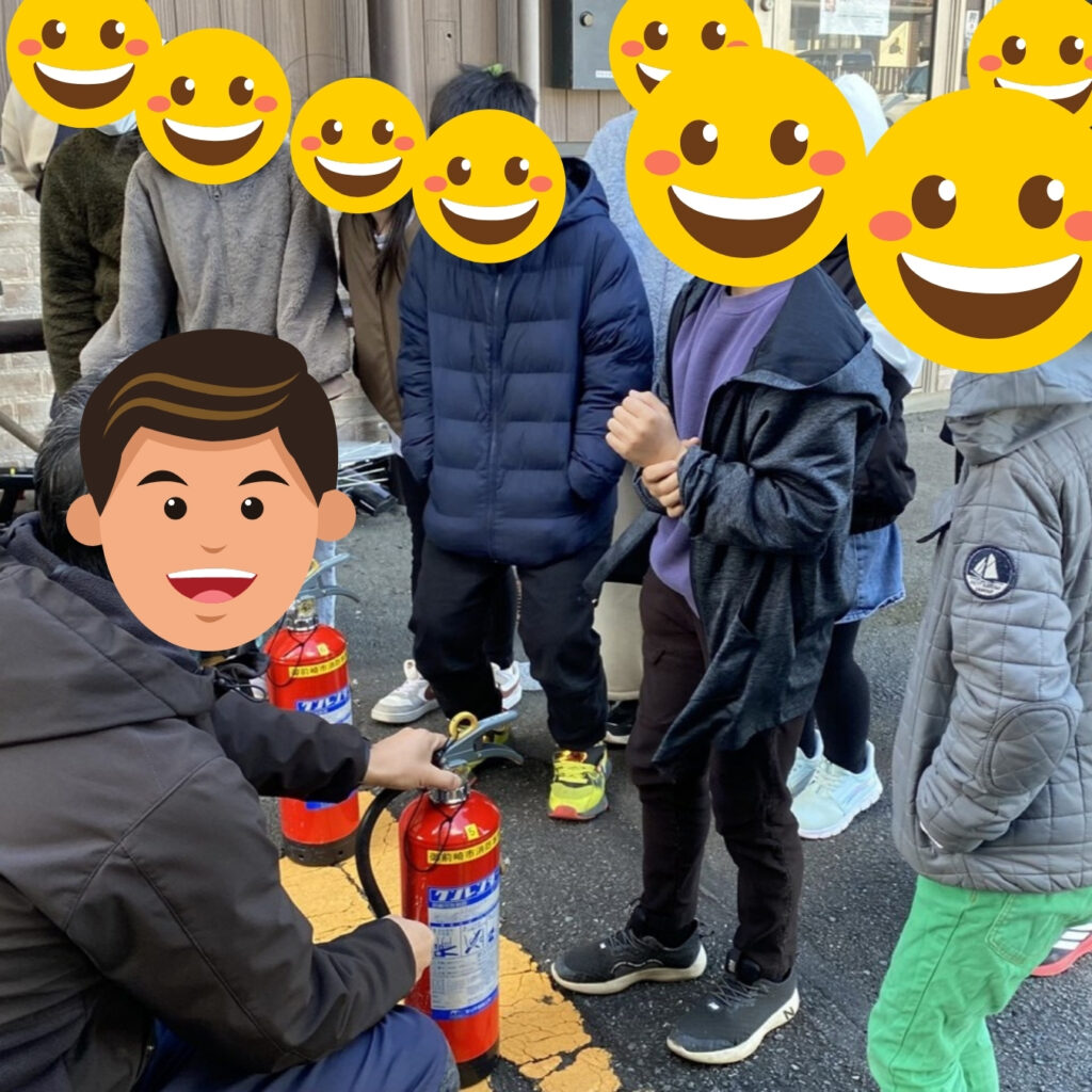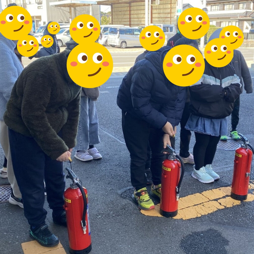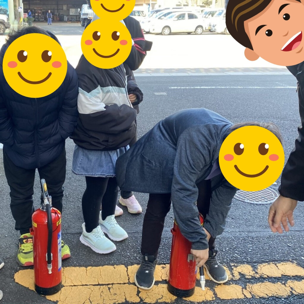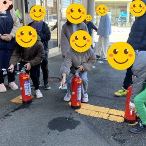 今日は特に冷え込みが強い一日となりましたが、子どもたちは職員の見守りのもと、水消火器の使い方を体験しながら訓練に取り組みました。