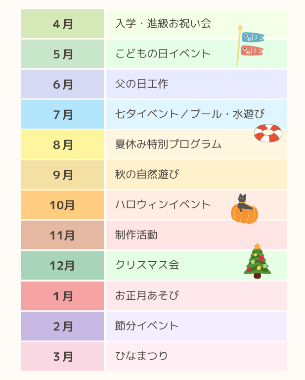 掲載している内容は、あくまで一日の流れや年間行事の一例です。お子さまの体調や学校行事、季節などに合わせて、日々の活動や行事内容は変更になる場合があります。安心して過ごせるよう、柔軟に対応しています。